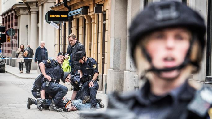 Two men were arrested last night in the hunt for a terrorist who drove a lorry down a crowded pedestrian street in Stockholm, killing at least four people and injuring 15 more.
